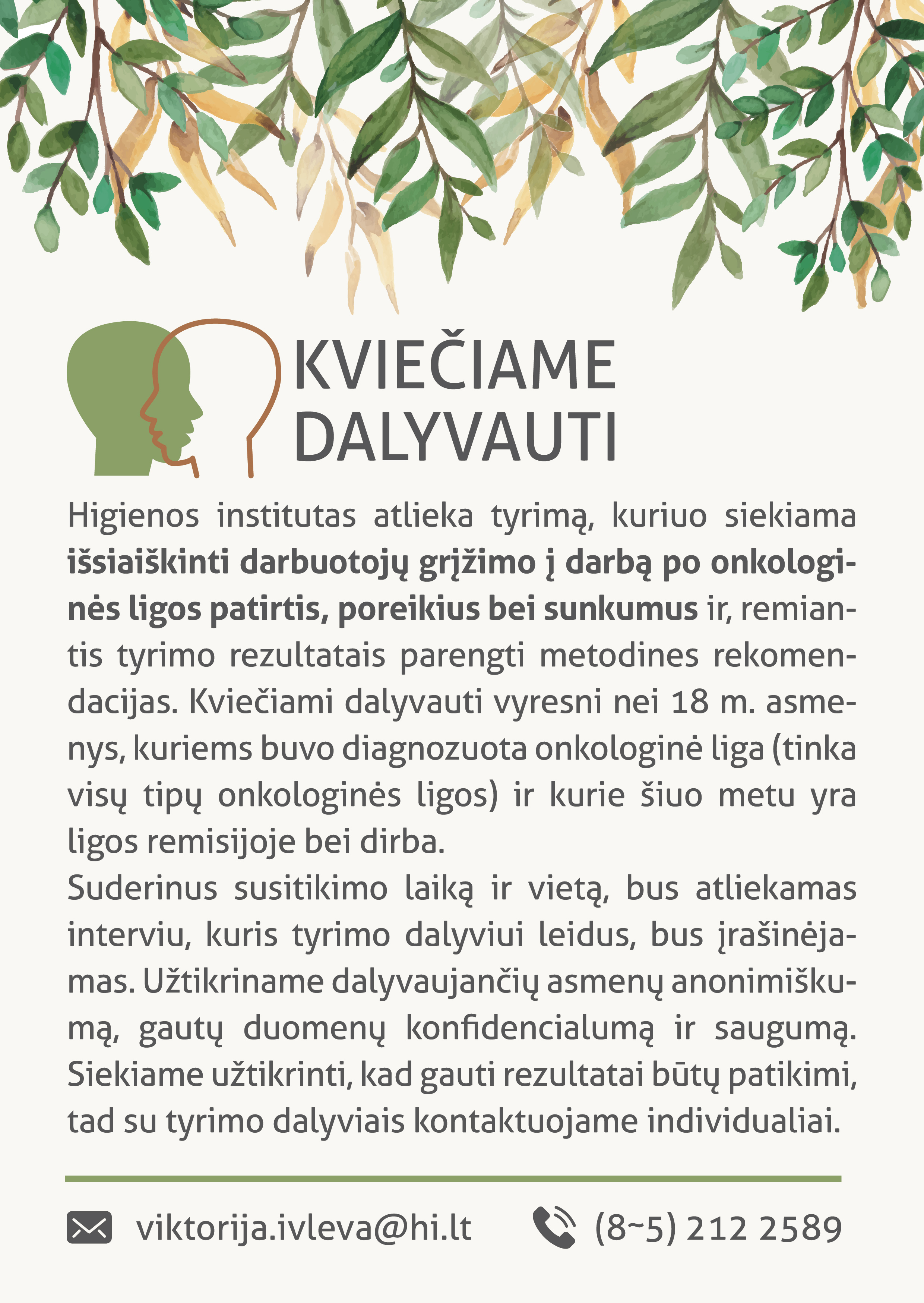 Higienos instituto tyrimas, kuriuo siekiama išsiaiškinti darbuotojų grįžimo į darbą po inkologinės ligos patirtis, poreikius, bei sunkumus